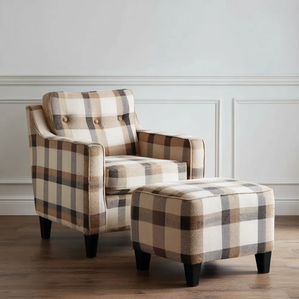 Der Sessel mit Hocker im Karomuster besteht aus strapazierfähigem Leinenstoff in Beige/Braun. Der Sessel hat eine PVC-Schaumfüllung und die Beine sind aus massivem Holz gefertigt. Der Hocker bietet zusätzlichen Komfort und Flexibilität.