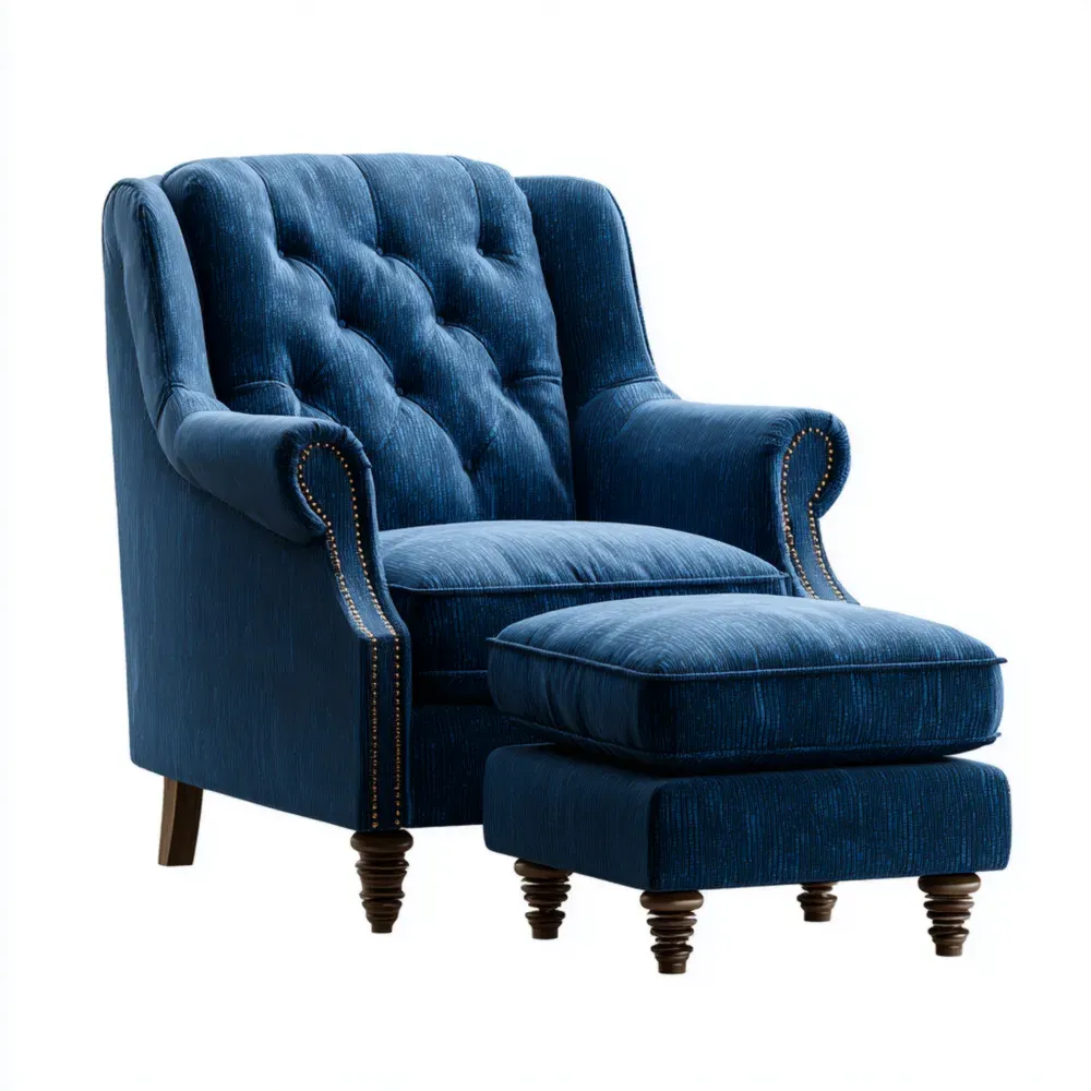 Der Sessel besteht aus einem dunkelblauen Leinenbezug und verfügt über eine stabile Holzkonstruktion. Die Sitzfläche ist mit Polyurethanschaum gepolstert. Der Sessel hat eine hohe Rückenlehne.