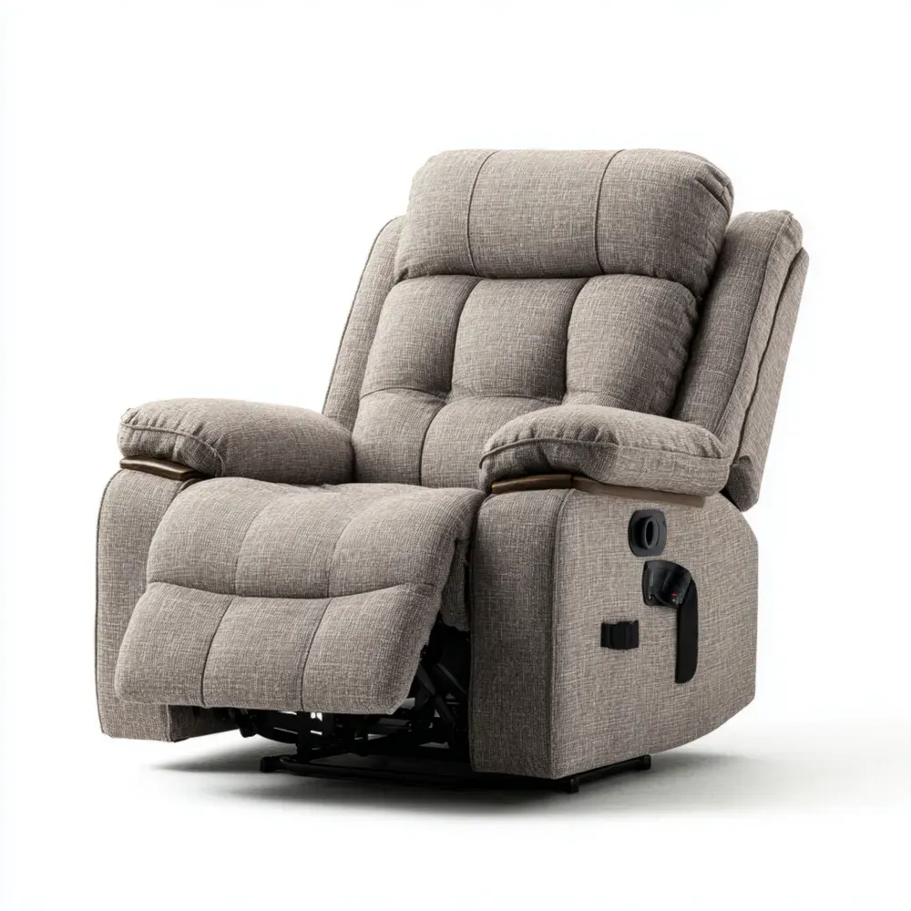 Der Liegesessel verfügt über einen strapazierfähigen Leinenstoff in Hellgrau. Die Polsterung besteht aus hochdichtem Schaumstoff, die Mechanik ist aus pulverbeschichtetem Stahl. Die Rückenlehne und das Fußteil sind manuell verstellbar und bieten flexible Entspannungspositionen.